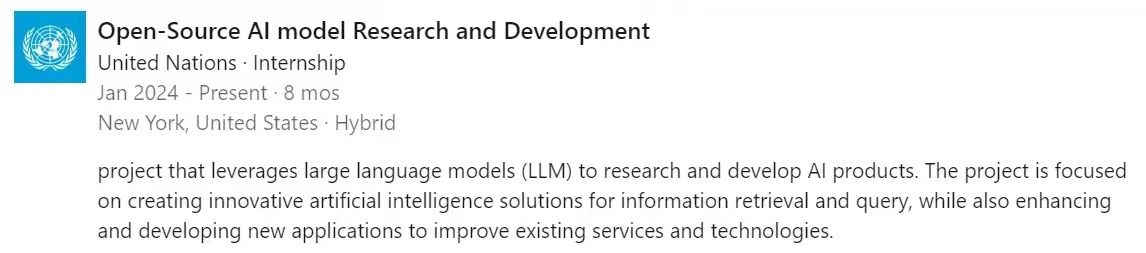 在实习期间,董一蒙积极参与了纽约Fordham大学与联合国合作项目“AI Diplomat”的开发与管理,项目主要涉及人工智能技术的应用开发、项目管理与协调、研究与数据分析等工作。团队致力于开发和优化一个支持外交事务决策的人工智能系统,能够分析复杂的国际关系数据,提供智能化建议,帮助外交官做出更明智的决策。项目还包括与联合国和纽约Fordham大学之间的合作协调,确保项目按计划进行,并通过数据收集和分析,为联合国提供数据驱动的洞察,支持其在国际舞台上的决策制定。最后,团队成员在联合国纽约总部汇报了项目的研究成果、开发进展和应用前景,为项目的未来发展提供了重要参考。