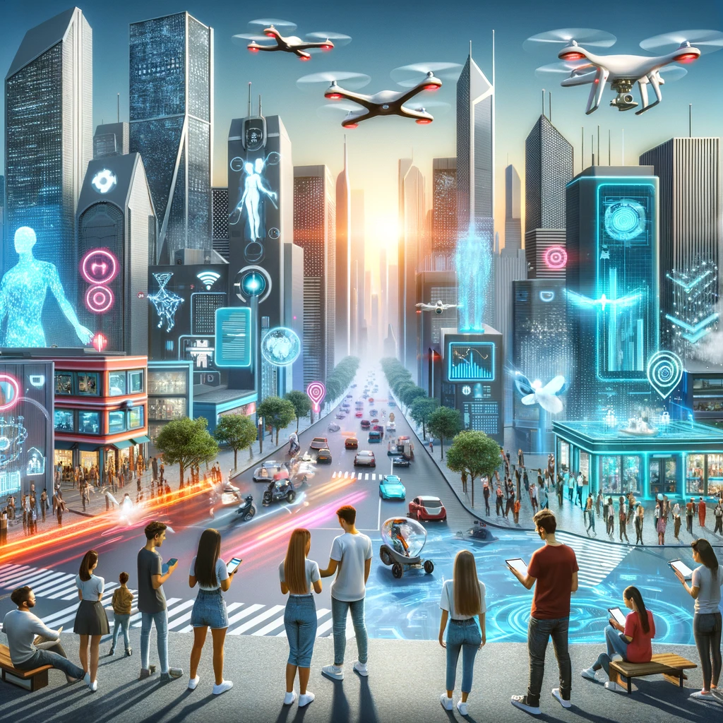 这幅画描绘了一个充满先进科技的城市,其中年轻人与高科技设备互动,展现了人工智能和大数据深刻影响着人类社会的发展。