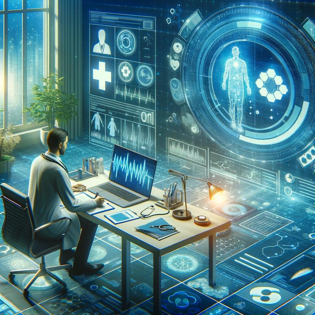 这幅画展示了远程医疗服务的场景。画面中,医生通过大数据技术分析患者的健康数据,并通过视频通话提供诊断和咨询服务。