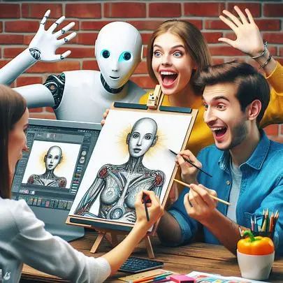用原画风格进行创作,一个人手捧电脑展示人工智能给他速成的画作,另一个人展示自己手绘的画。
