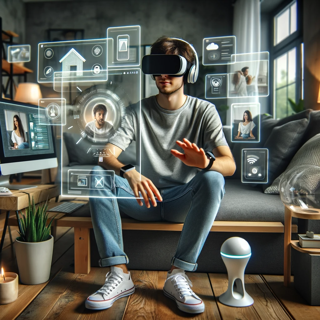 这幅画展示了一位年轻人坐在其现代化的家中,画面中科技与舒适生活的融合,体现了科技对日常生活的深刻影响。
