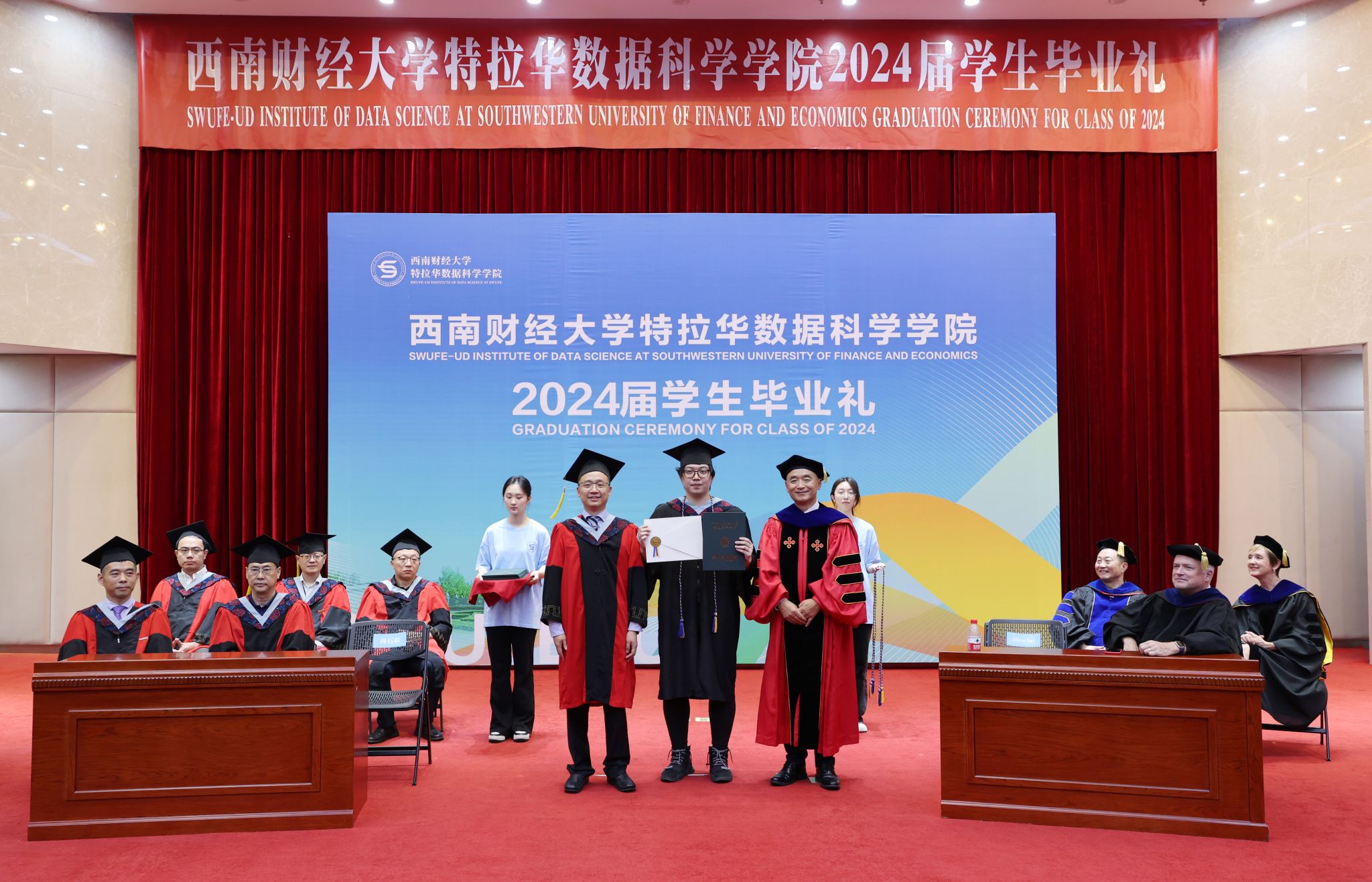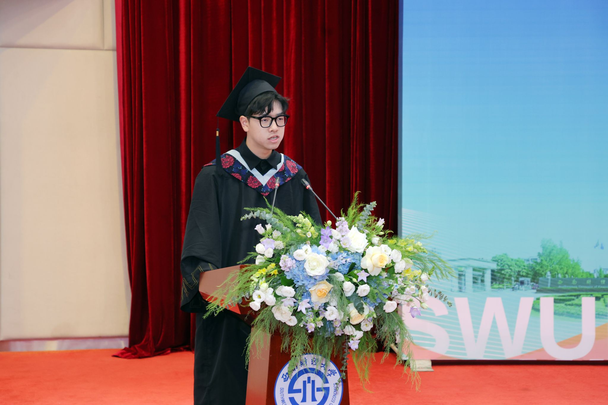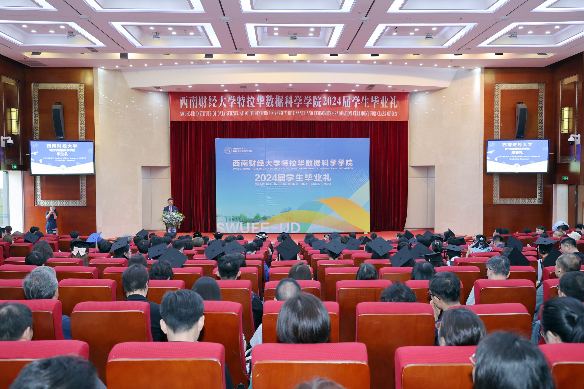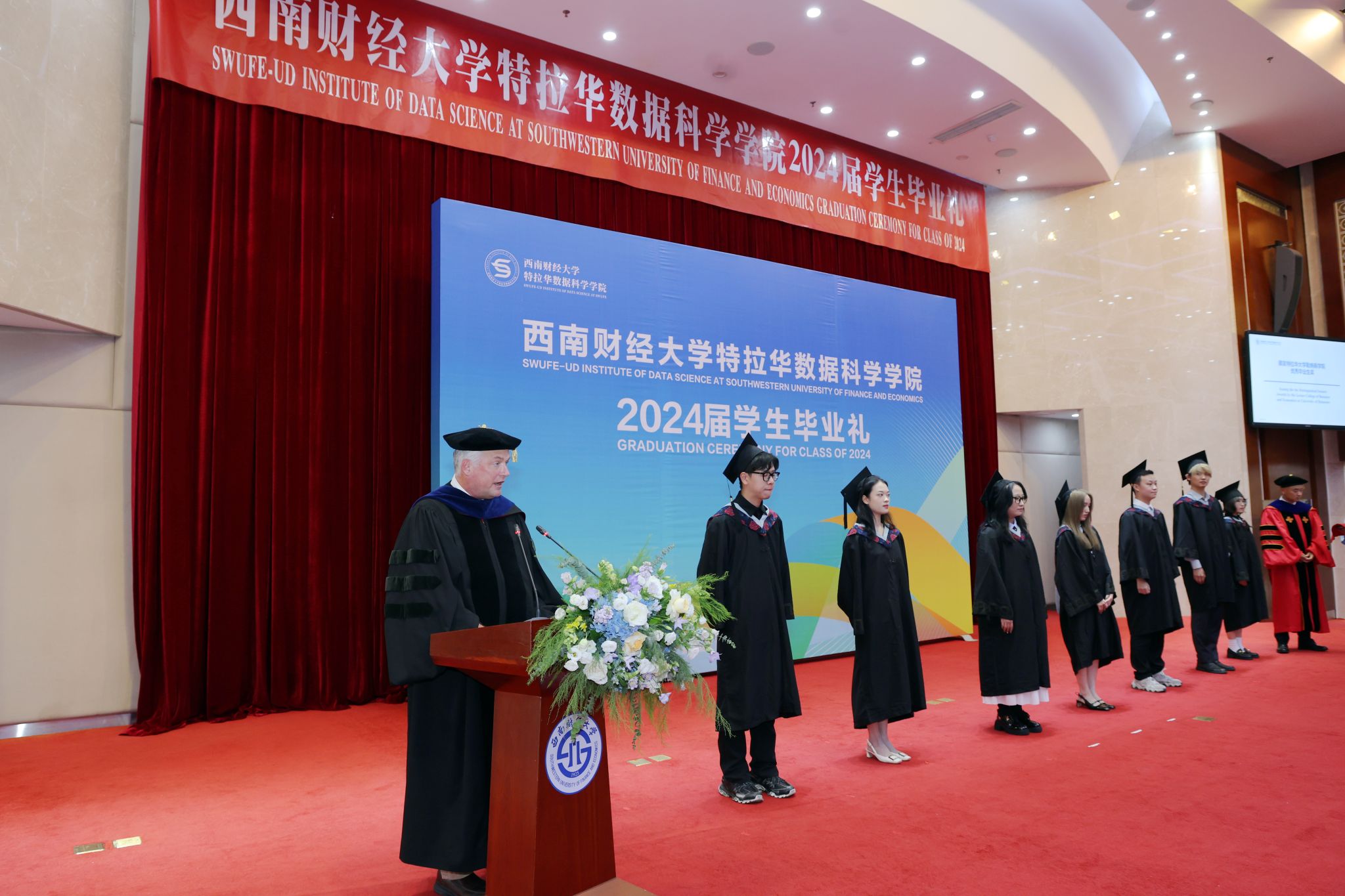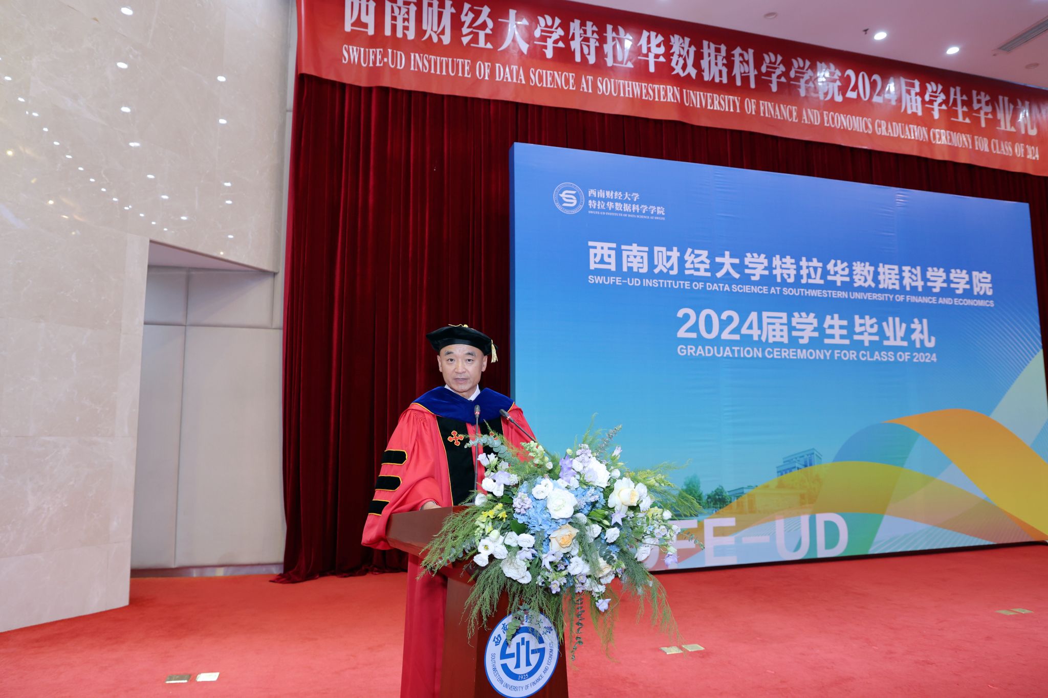 卓志首先致辞。他向圆满完成学业的2024届毕业生表示由衷祝贺,希望同学们始终牢记和传承百年西财精神,在守正创新中不断追求卓越,为推动中国与世界各国文明交流互鉴作出积极贡献。