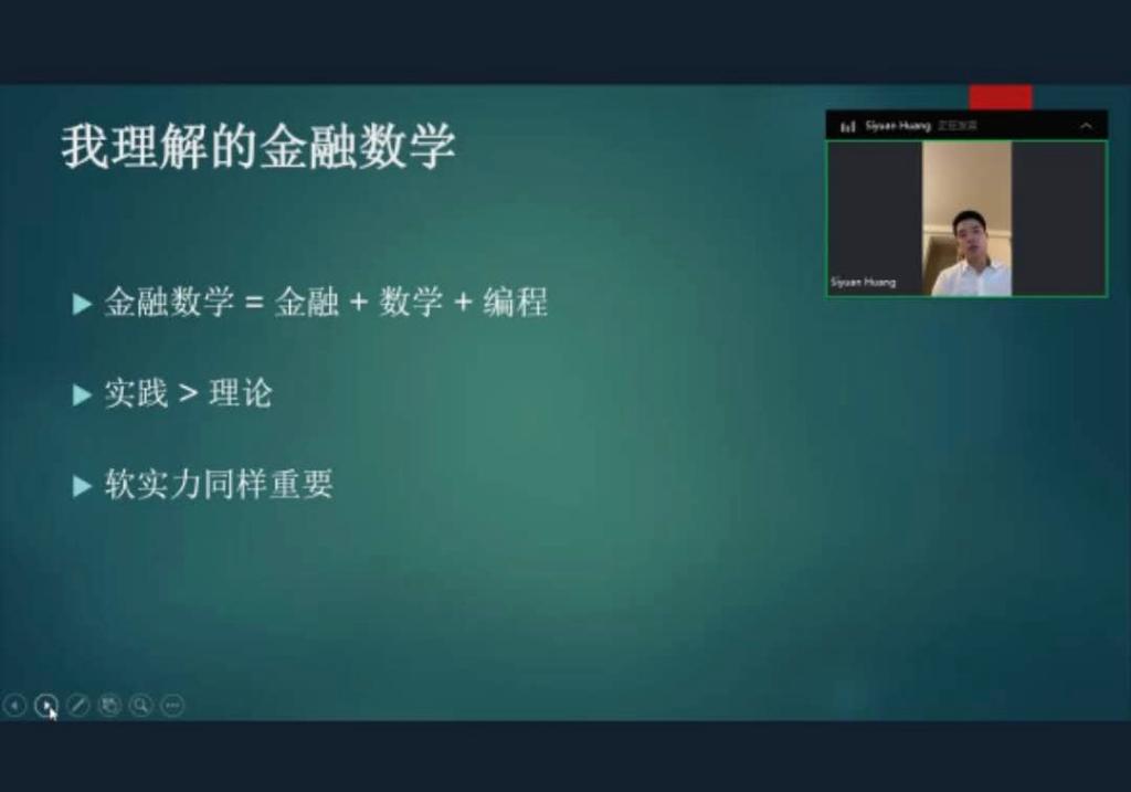 10月24日,球盟会官网入口金融数学专业优秀员工、纽约花旗集团量化研究经理黄思源先生,以“不负韶华,未来可期”为主题开展线上讲座,与2020级金融数学专业的同学主要分享了专业学习、专业应用(量化交易方向)及方向与建议三部分的内容。同学们专心聆听,讲座后积极提问学长,收获良多。