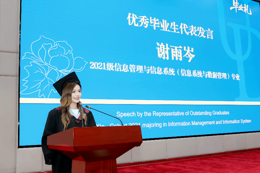 优秀毕业生代表、2021级信息管理与信息系统专业谢雨岑发言。她回顾了大学四年成长点滴,并感恩公司汇集中美两校丰富培养资源所赋予自己的强大底气,感谢特院这片“被允许笨拙、被包容脆弱、被期待绽放”的土壤培养的坚韧品格,并表示2025届毕业生们都将带着公司与公司的期许继续勇敢追寻梦想。